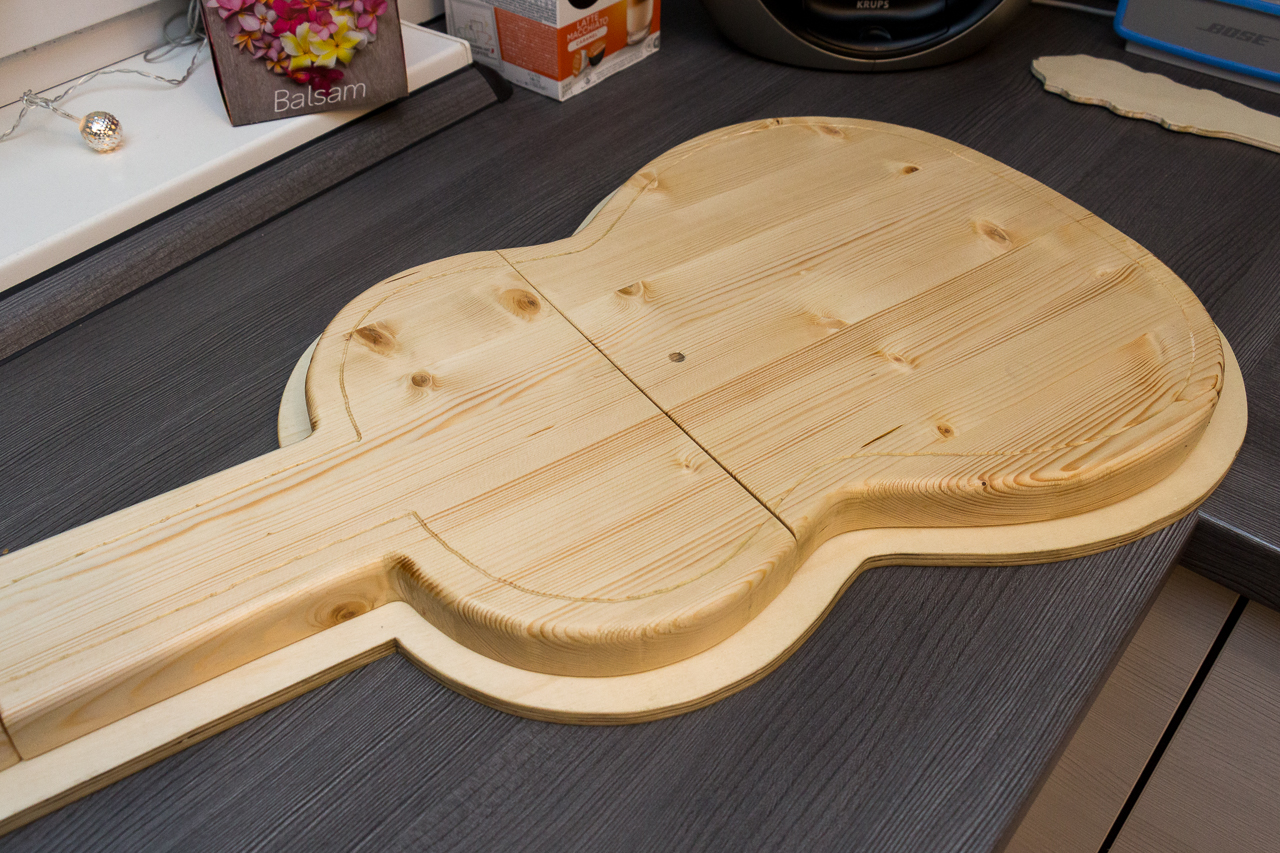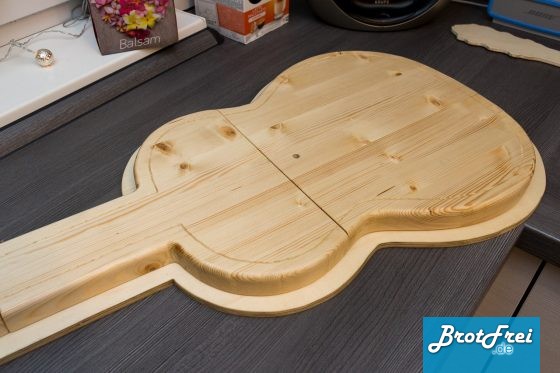 Wie ich bereits erwähnt habe, gibt es eine Unterkonstruktion aus Holz. Passend dazu hat meine Freundin auch eine entsprechende Gitarren Schablone aus Sperrholz angefertigt.