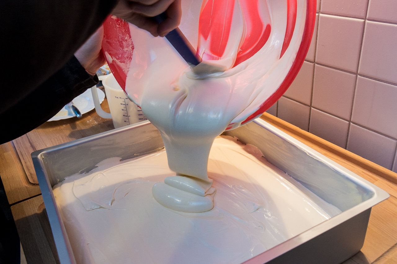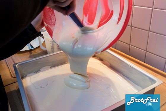 Wenn alles gut verrührt ist, ergibt das Ganze eine schöne geschmeidige, dickflüssige Masse. Diesen dickflüssigen Teig gibst du jetzt gleichmäßig in die große Tortenbackform und streichst ihn bis in die Ecken glatt.
