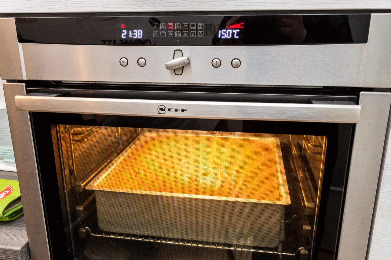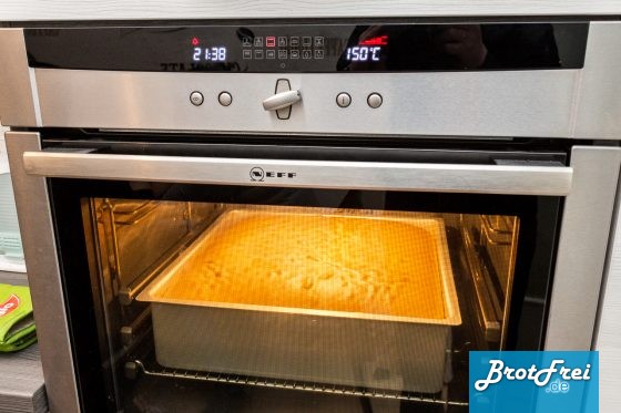 Der Teig kommt anschließend in den auf 150°C vorgeheizten Backofen. Hier muss der Teig jetzt ca. 1 Stunde und 20 Minuten mit Ober/Unterhitze backen. Ich vermeide beim Backen den Umluftbetrieb, weil der Teig so gleichmäßiger hoch kommt.