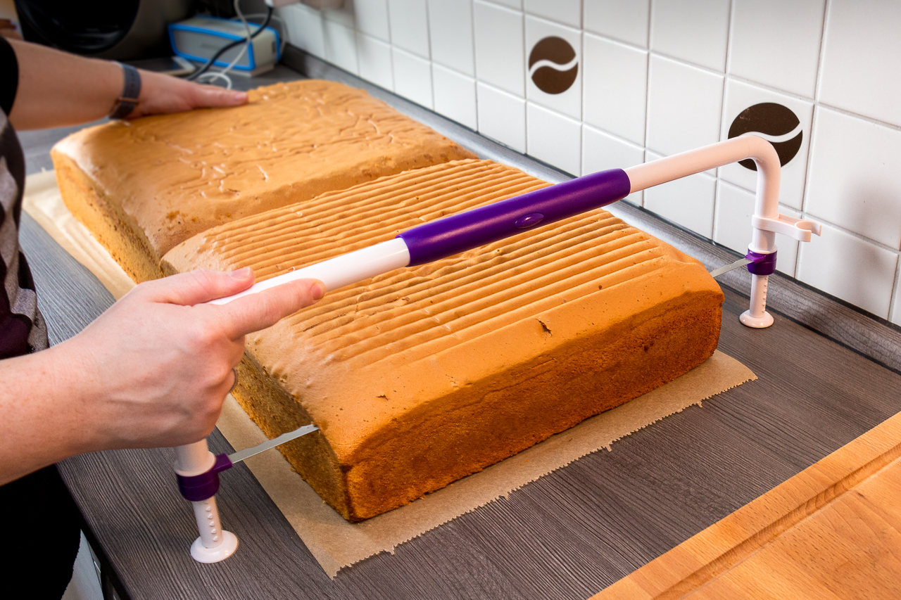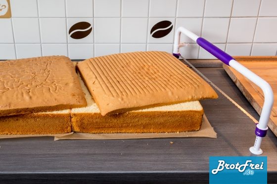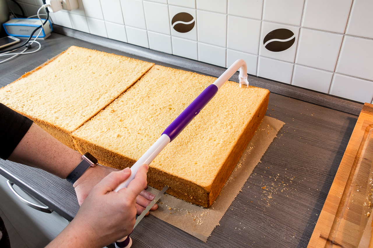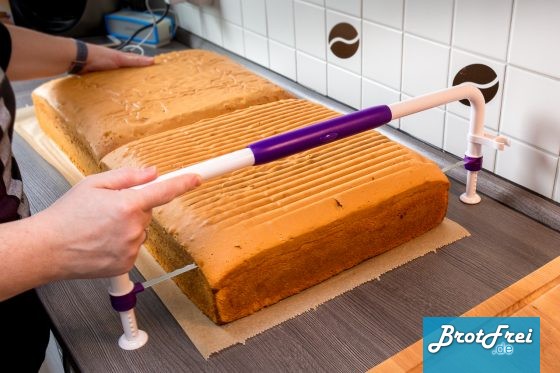 Am anderen Morgen, wenn die Tortenböden abgekühlt sind, musst du daraus die einzelnen Scheiben schneiden. Dazu benötigst du am besten eine Tortensäge. Ich habe mir eigens für große Torten eine höhenverstellbare Tortensäge von Wilton mit einem Sägeblatt besorgt.
