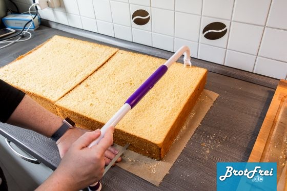 Damit schneide ich die einzelnen Tortenböden in 4 Ebenen. Die obere Ebene benutze ich nicht weil die Fläche nicht eben ist. Aber die kann man so nebenbei verzehren.