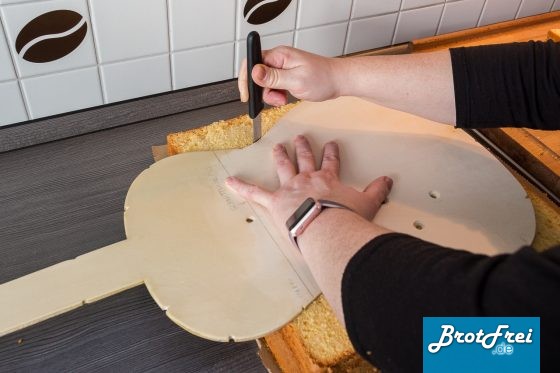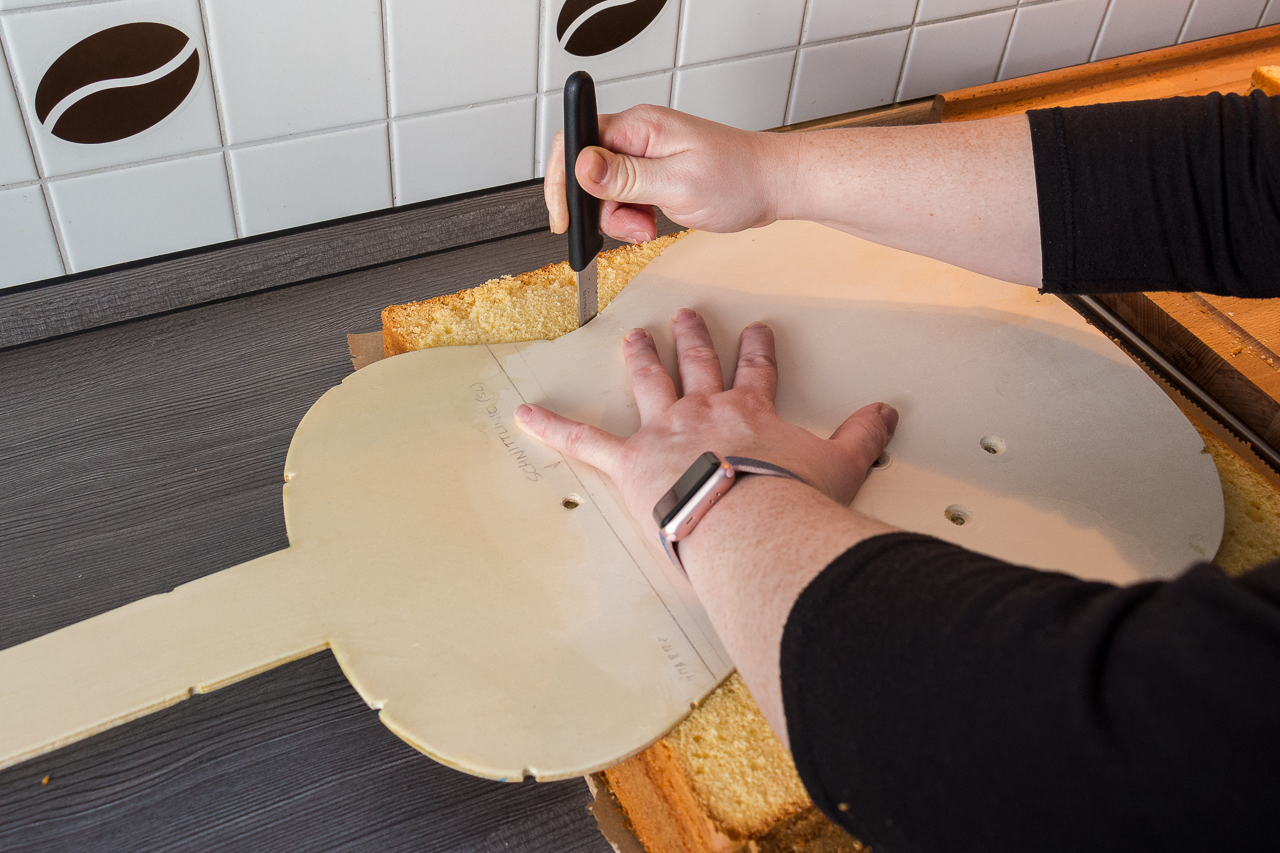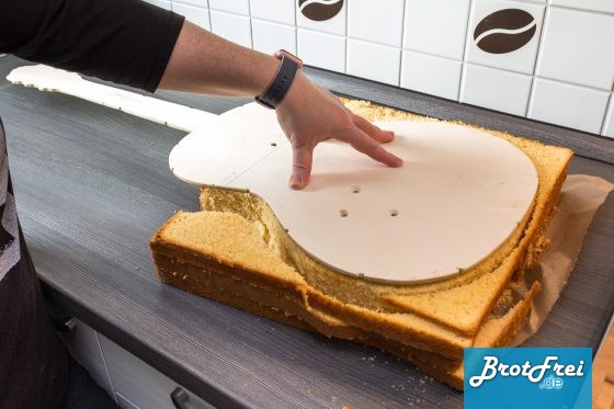 Mit dieser Schablone und einem normalen Küchenmesser konnte ich dann ganz bequem die Grundform der Gitarre aus den Tortenböden schneiden. Hierbei müssen alle 3 Böden genau übereinander liegen.