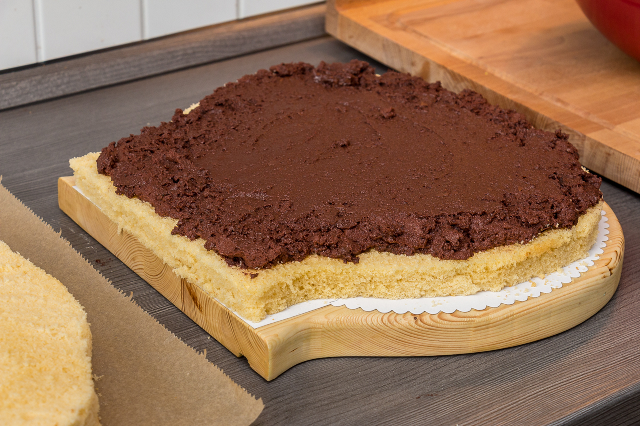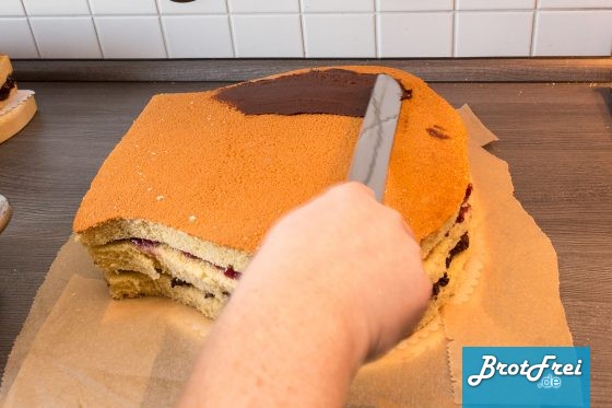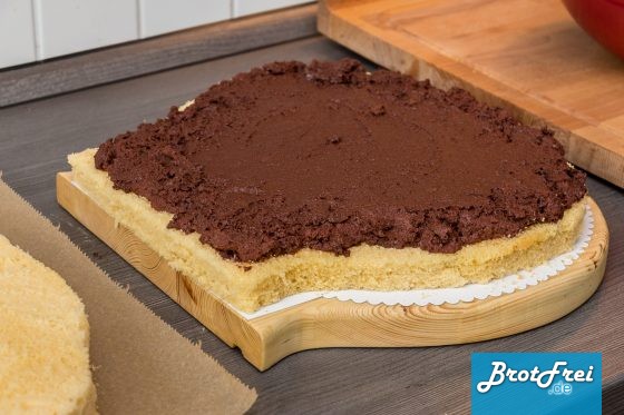 Die „Mousse au Chocolat“ habe ich dann reichlich auf den untersten Tortenboden aufgetragen und gleichmäßig verstrichen. Im Anschluss wurde der zweite Tortenboden aufgelegt.