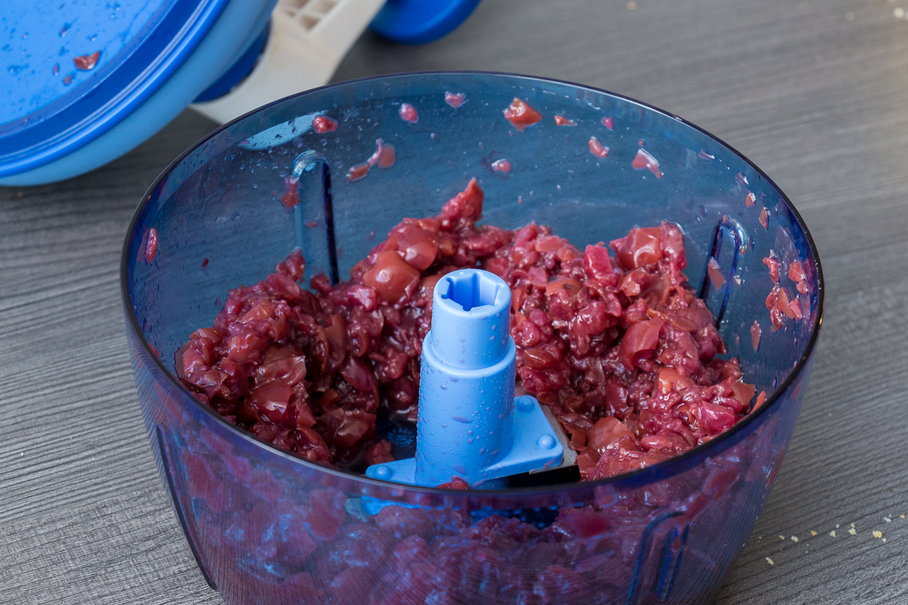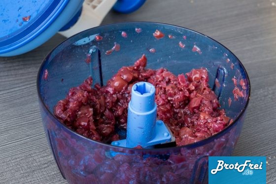 Die eingelegten Kirschen musst du nun abgießen und gut abtropfen lassen. Anschließend habe ich die Kirschen püriert, aber nicht zu stark, da man ja nachher noch die Fruchtstücke in der Füllung haben möchte.