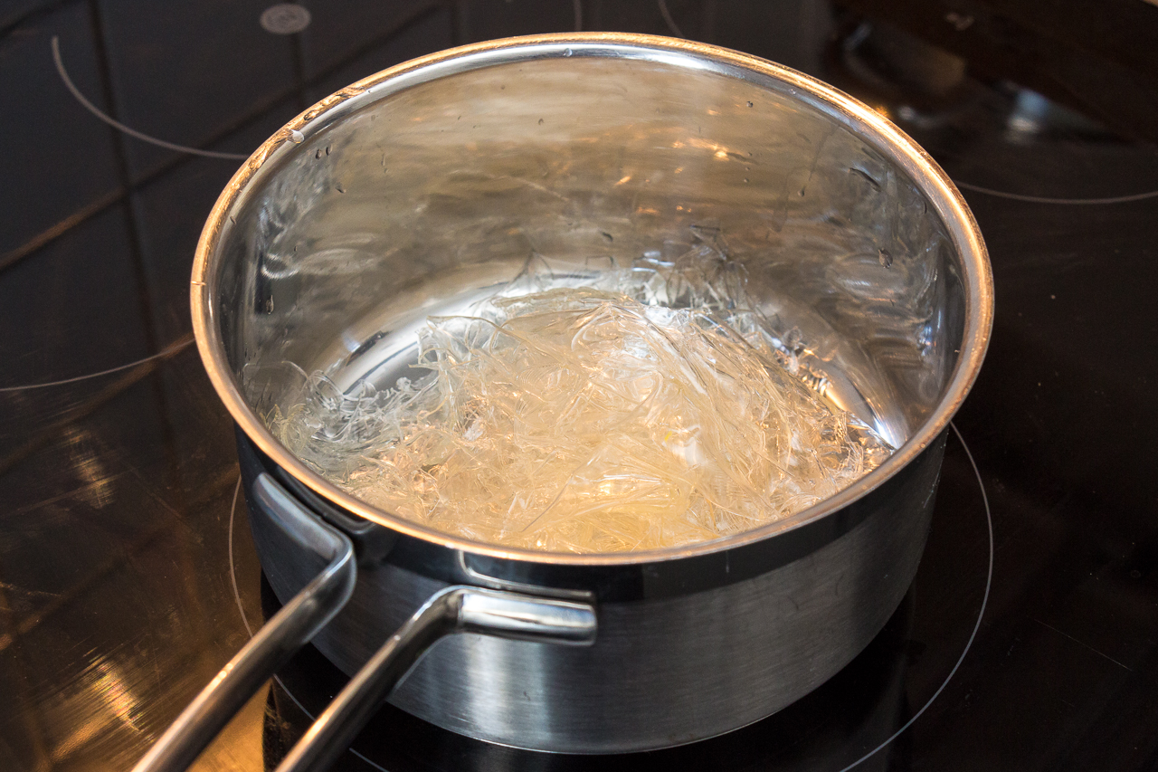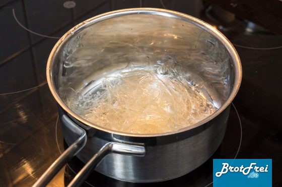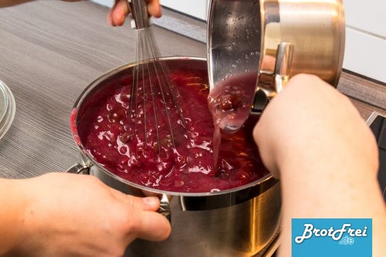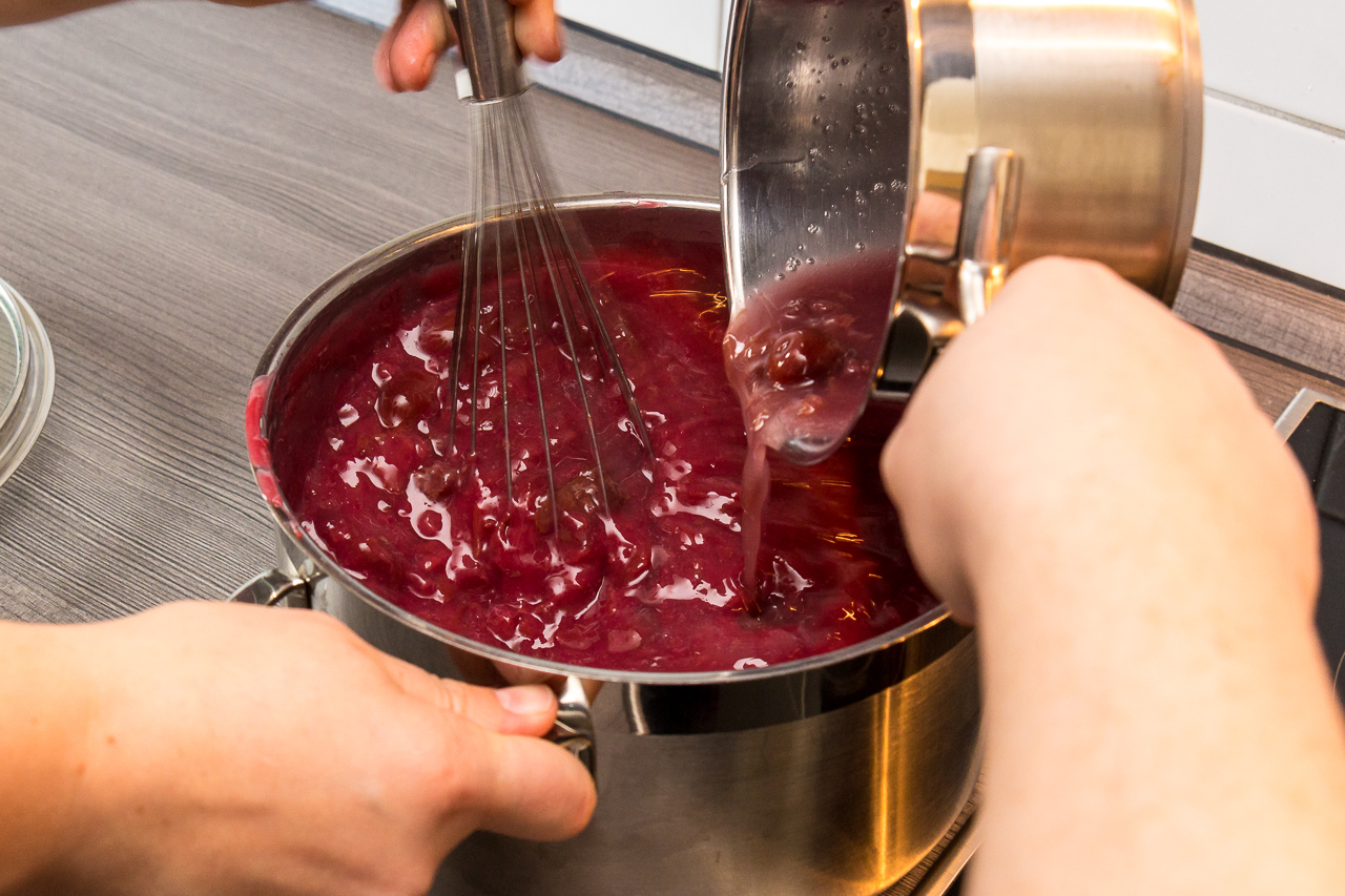 Jetzt nimmst du das Kirschwasser und dickst das mit etwa 12 bis 16 Blatt Gelatine an. Anschließend gibst du die Kirschen dazu und deine Füllung ist fertig.