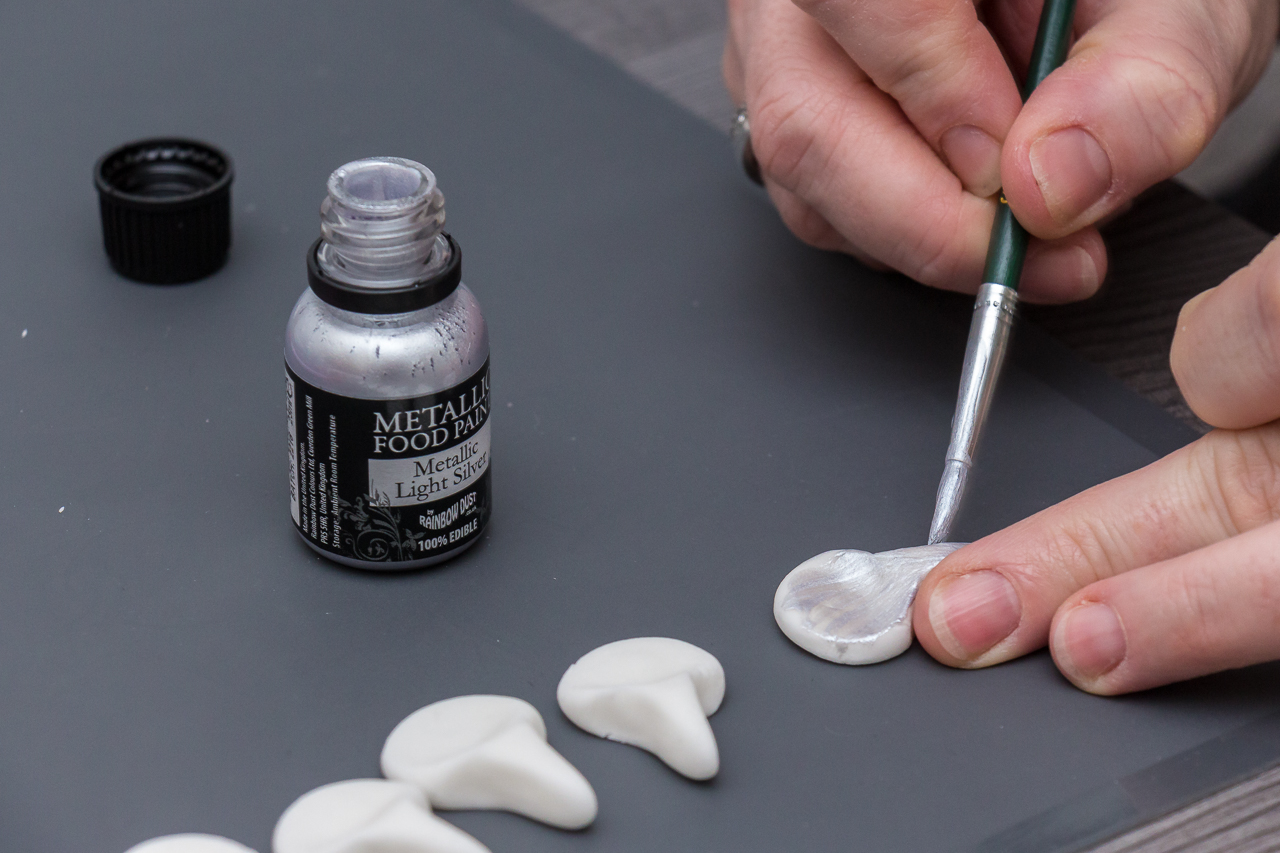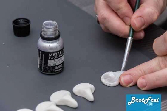 Die Dekoration und die Saiten habe ich aus Modellierfondant geformt. Die Wirbel und den Steg habe ich per Hand geknetet und anschließend mit Lebensmittelfarbe in Silber angepinselt.