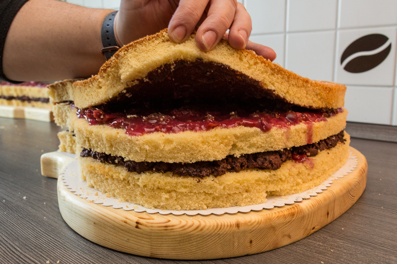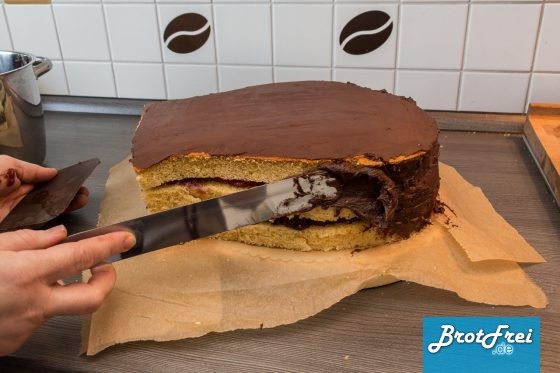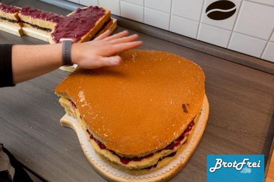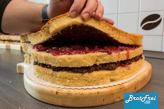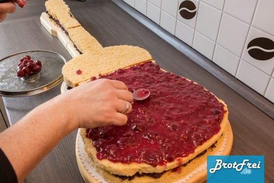 Im nächsten Schritt musst du nur noch die Kirschmasse gleichmäßig auf die Torte auftragen. Anschließend werden die letzten abschließenden Tortenböden aufgelegt.