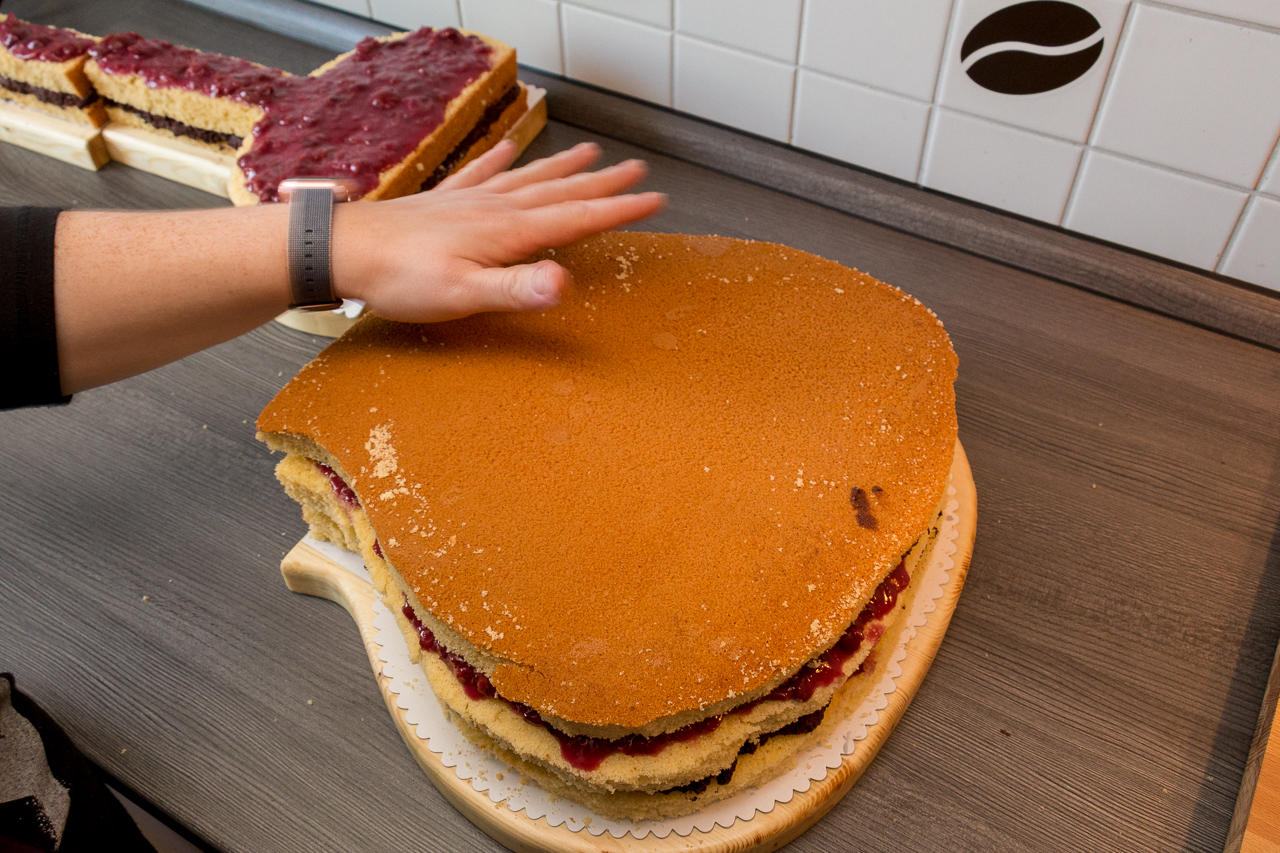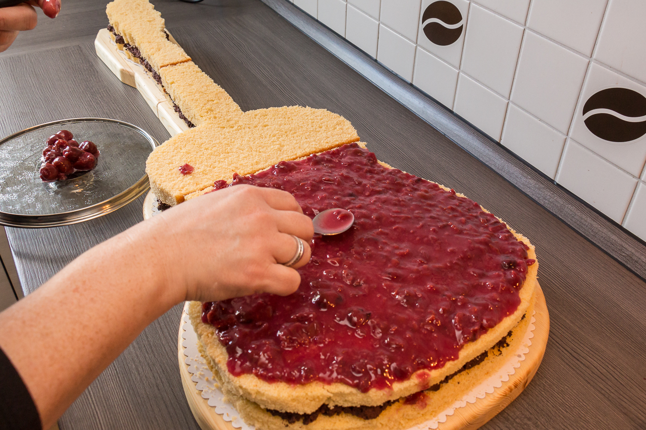 Die Schwierigkeit bestand darin, die Torte in Einzelteilen zu backen um Sie im normalen Kühlschrank zu kühlen und als Ganzes zu transportieren. Diese Herausforderung war doch recht schwierig.