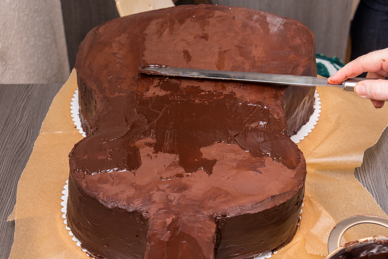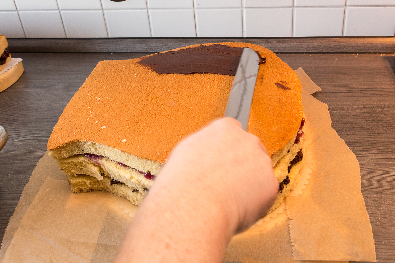Als letzte Vorbereitung musste ich die Spalten zwischen den Einzelteilen der Torte mit Ganache verstreichen und gut glätten. Damit habe ich den kompletten Unterbau für das Fondant vorbereitet.