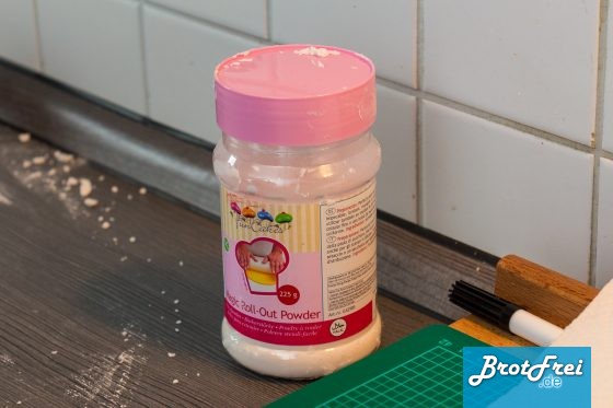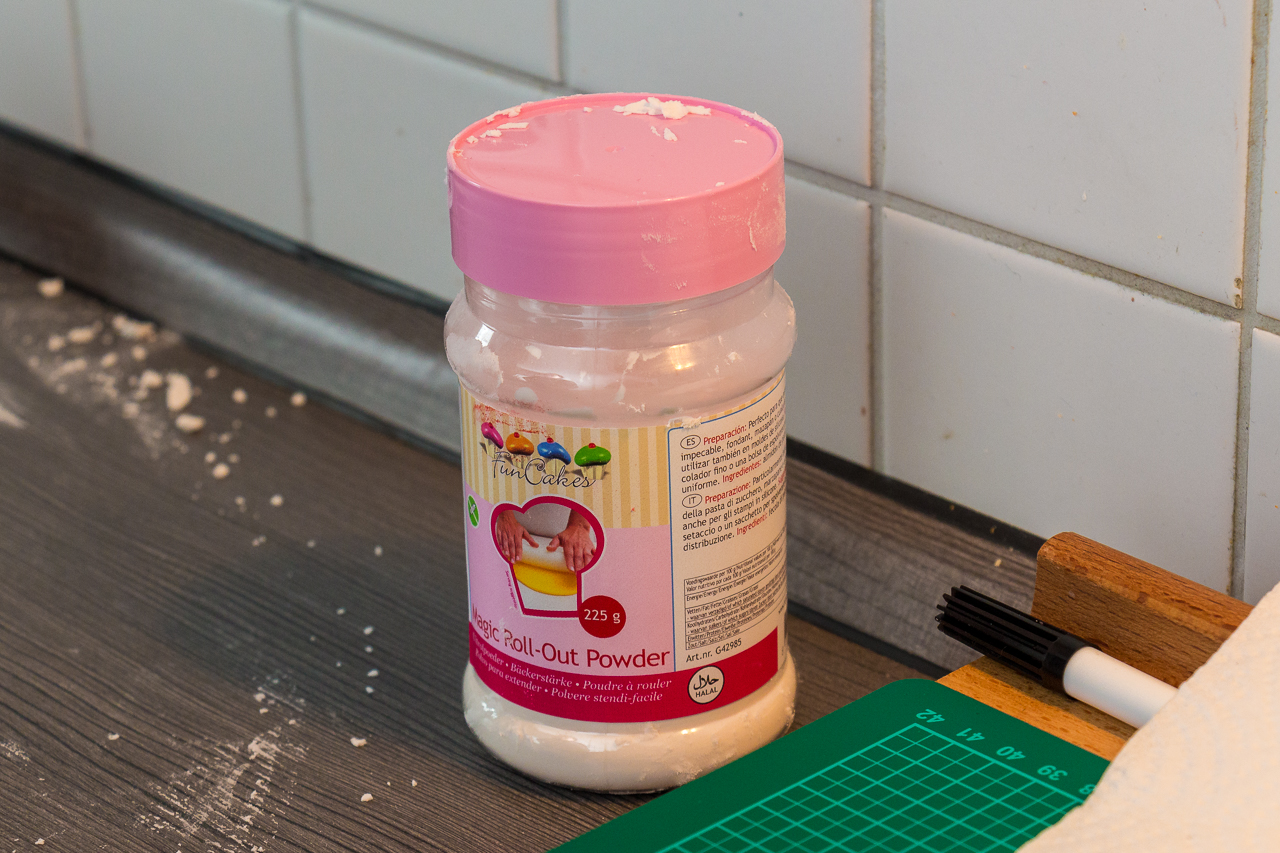 Damit das Fondant nicht auf der Arbeitsplatte anklebt habe ich die Fläche mit etwas Bäckerstärke bestreut. Ich nehme hier immer gerne das Magic Rollout Powder von Funcakes.