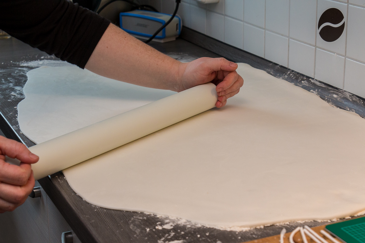 Jetzt kommt der schwierigste Teil, die 3kg Fondant dünn ausrollen. Dafür brauchst du eine große Fläche. Bei mir ging das auf der Arbeitsplatte der Küche gerade so.