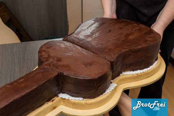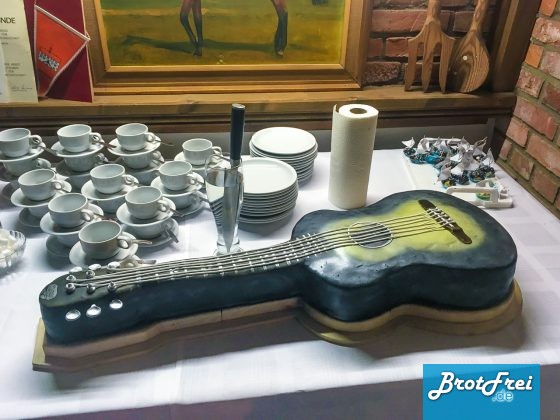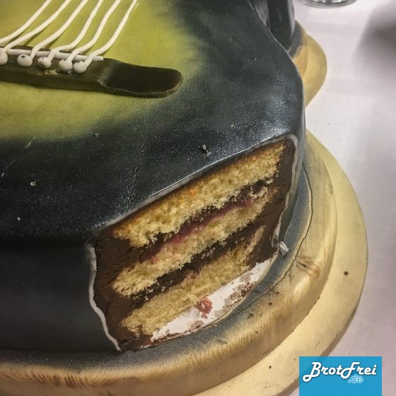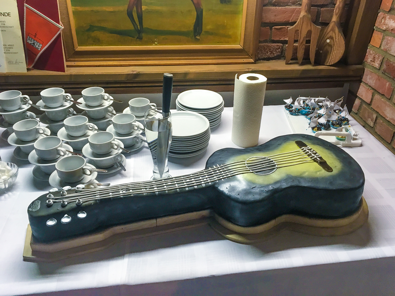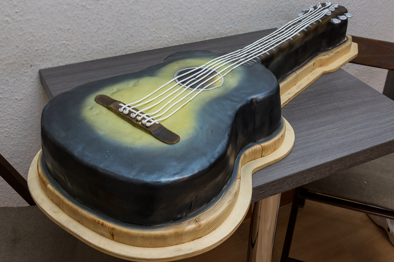 Die Gitarren-Torte in Originalgröße ist sehr gut bei den Gästen angekommen. Die meisten wollten die Torte gar nicht anschneiden. Viel zu schade zum Essen, waren die Aussagen.