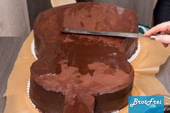 Als erstes habe ich alle Einzelteile der Gitarrentorte mit Ganache eingestrichen. Mit der Ganache werden die Unebenheiten ausgeglichen und die ganzen Krümel gebunden. Die Ganache bietet zudem auch den perfekten Untergrund für unsere Fondant-Decke.