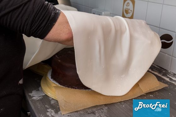 Wenn du das Fondant schön glatt ausgerollt hast, musst du vorsichtig unterfassen und es auf die Torte heben. Ich habe das mit der Hilfe einer zweiten Person erledigt. Du kannst auch versuchen, das Fondant erst auf einen großen Rollstab aufzurollen und dann vorsichtig über die Torte abzurollen.