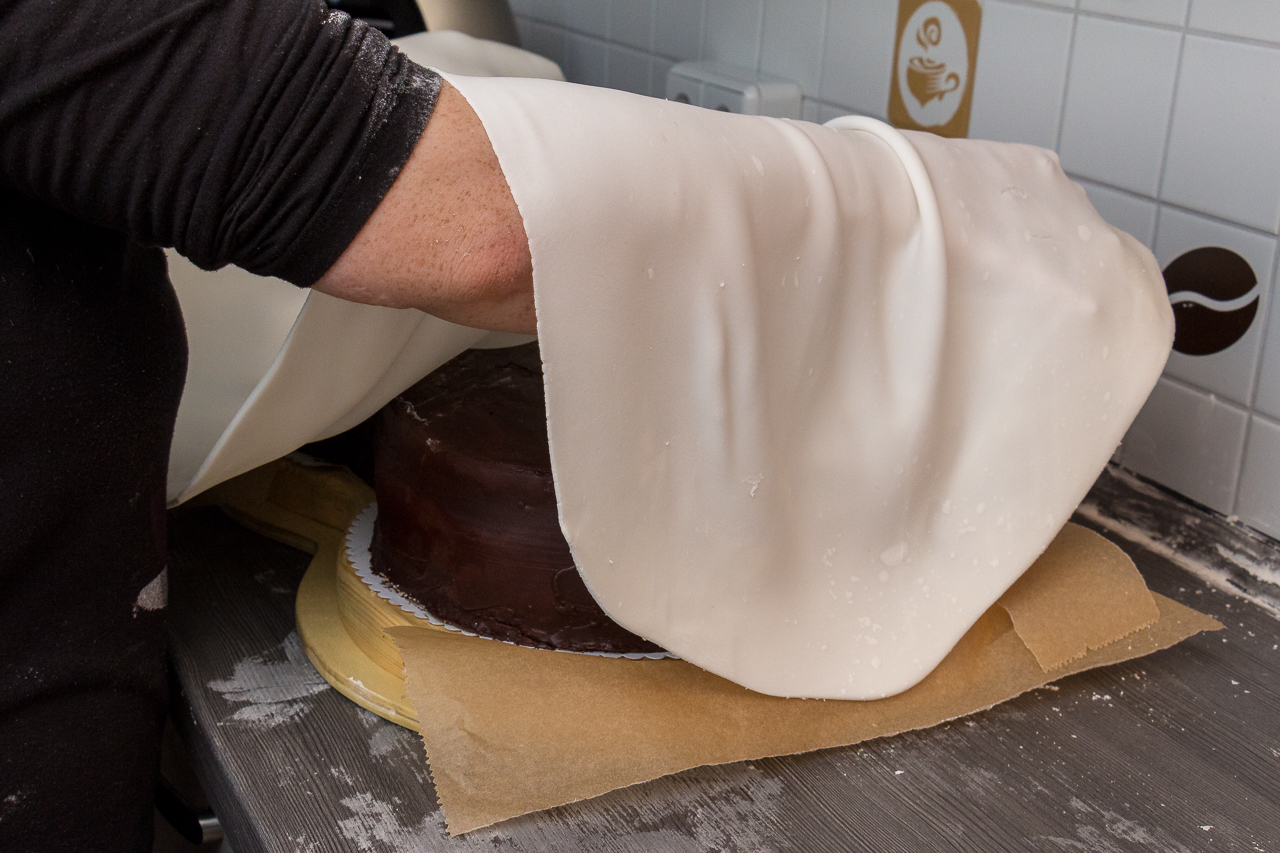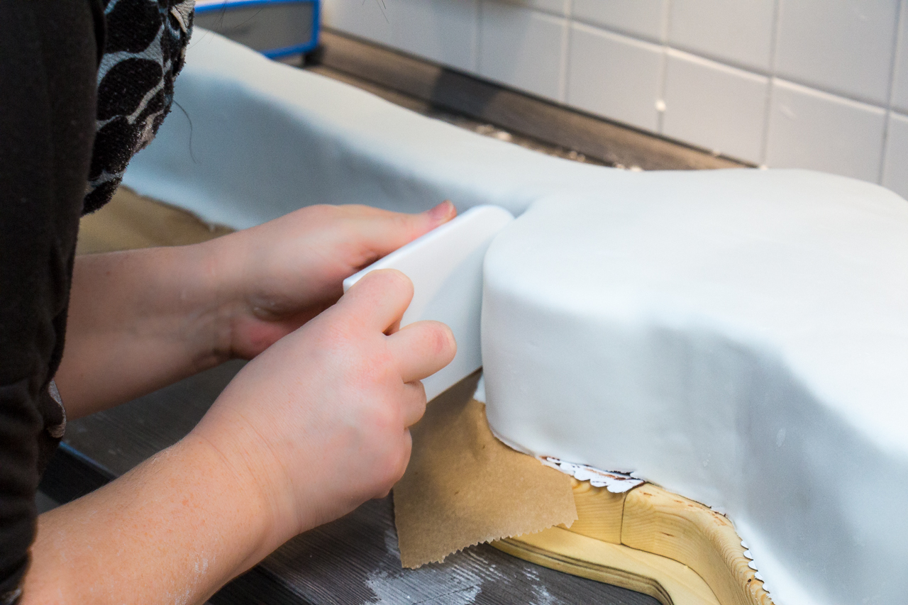 Im Anschluss nochmal das Fondant schön glatt reiben, so das auch wirklich alle Unebenheiten verschwinden. Das war mein erstes Projekt in der Größe, daher habe ich das Fondant doch nicht so glatt bekommen wie ich das gern gehabt hätte. Aber ich gelobe Besserung.