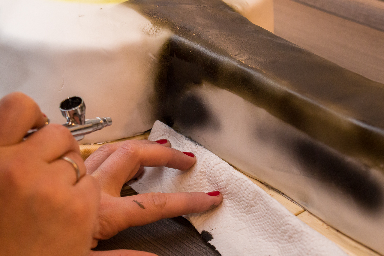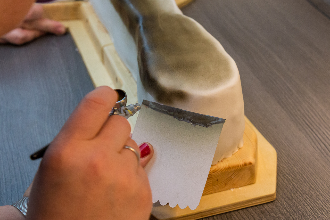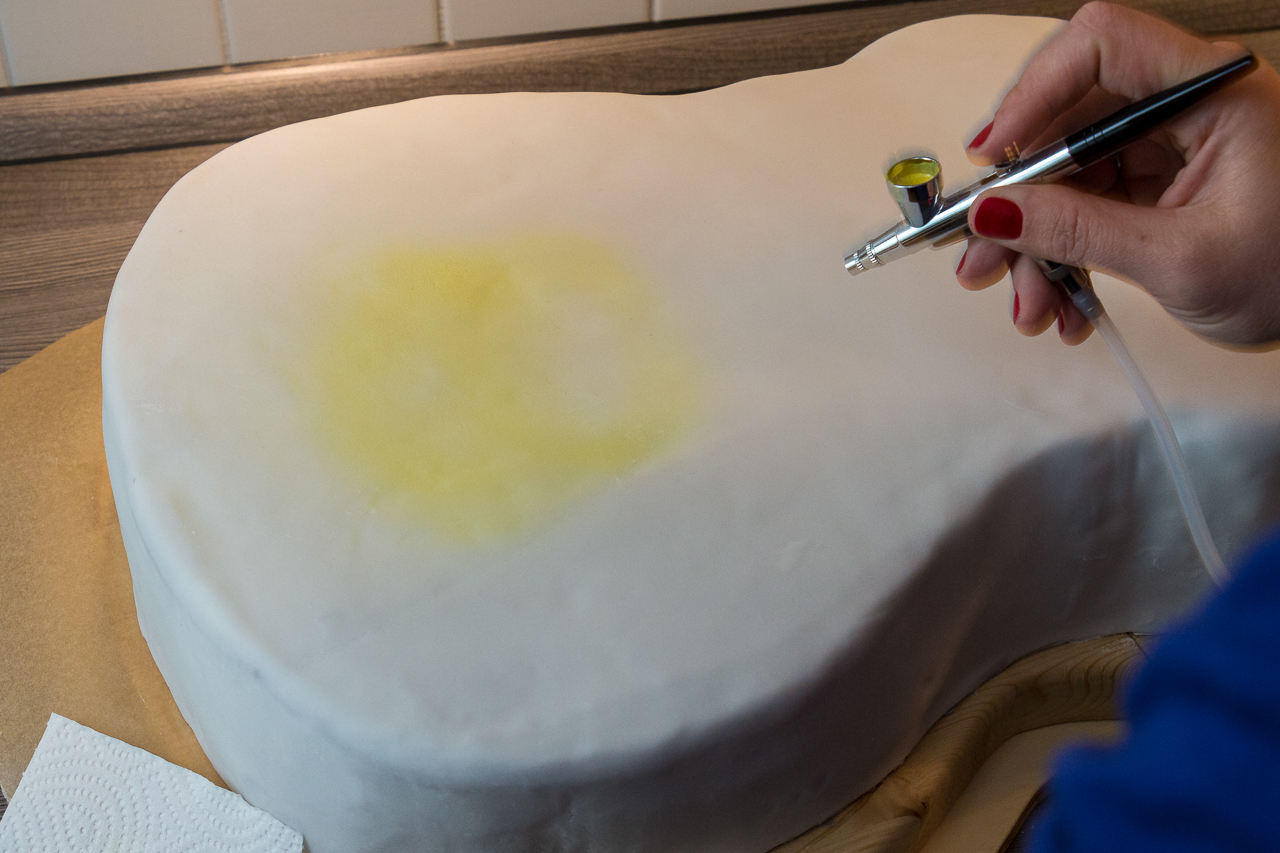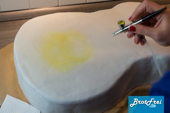 Nachdem die Torte soweit fertig ist, geht es an die Farbe. Hier wollte ich zu ersten Mal mit Airbrush arbeiten. Ich kann euch sagen, das es schwerer aussieht als es ist. Und es macht richtig Spass.