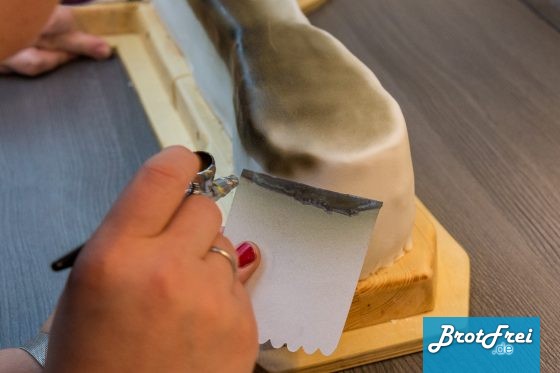 Jetzt gilt es die Seiten und die Decke mit einem Fondantroller schön glatt zu streichen. Die überstehenden Ränder musst du dann nur noch mit einem Fondant-Cutter oder einem scharfen Messer vorsichtig abschneiden.