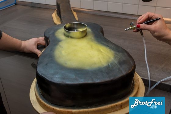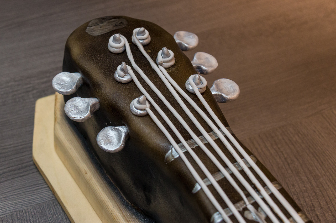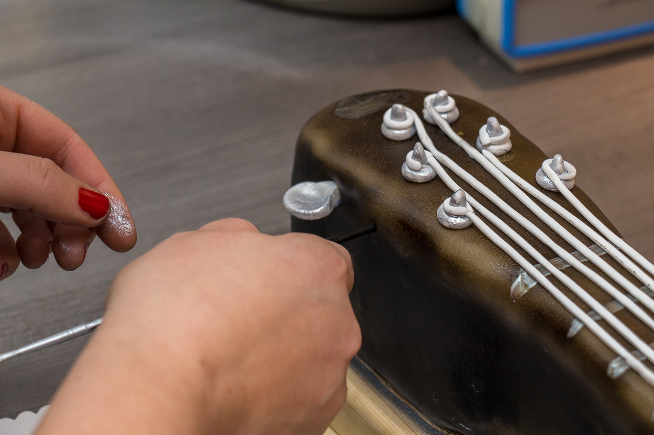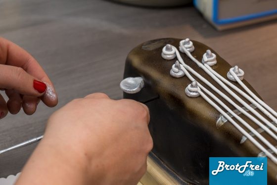 Die einzelnen Bundstege sind nur mit silberner Lebensmittelfarbe aufgemalt und die Stellräder der Wirbel werden seitlich in die Torte gesteckt. Dazu habe ich mit einem Modellierwerkzeug kleine Löcher seitlich in die Torte gedrückt.